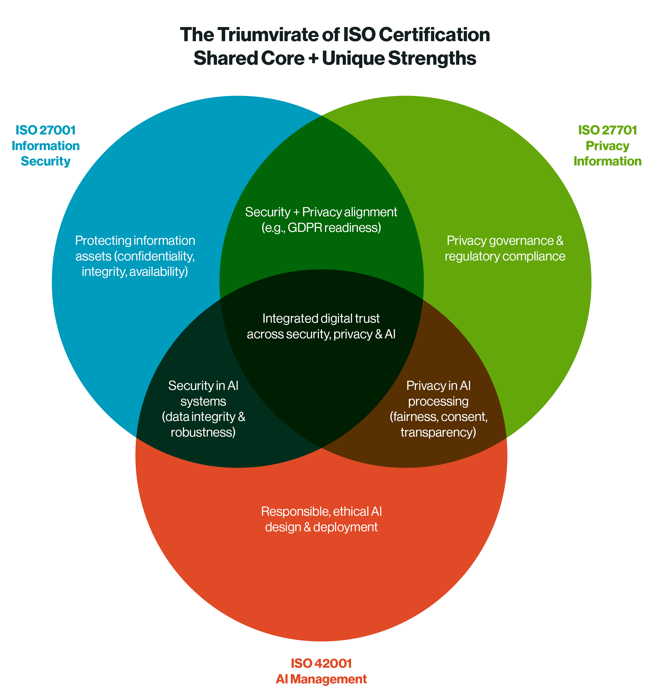 Forward-looking organizations that integrate ISO 27001, ISO 27701, and ISO 42001 are not just meeting compliance checkboxes—they are leading the conversation on digital trust.