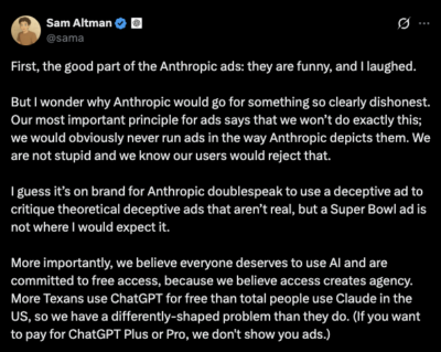 His post was interpreted as a mix of pushback and a declaration that the market—not satire—would determine the future of AI monetization strategies.
